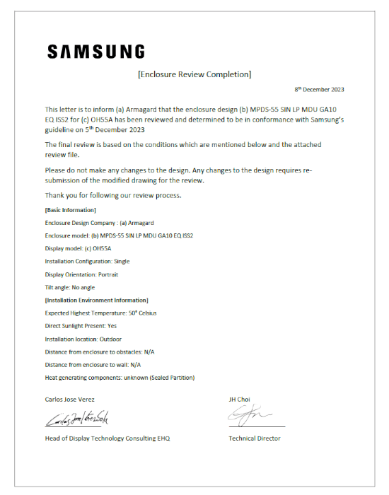 - Wyświetlacze Samsunga IP56 są odporne na kurz i ulewny deszcz.