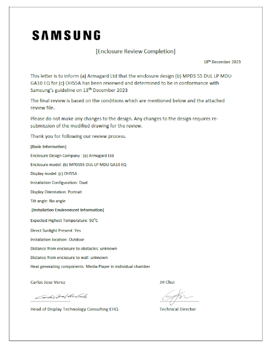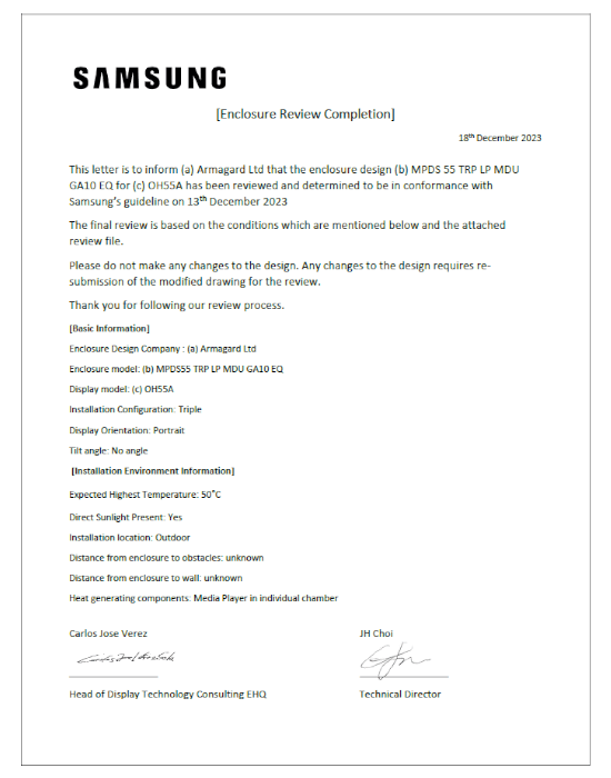 Dzięki projektowi oficjalnie zatwierdzonemu przez Samsung Korea, totem może pomieścić do trzech monitorów Samsung. Temperatura otaczająca monitor Samsung jest utrzymywana w chłodzie dzięki zarządzaniu przepływem powietrza. Łatwy dostęp umożliwia zmodernizowanie wyświetlaczy i odtwarzaczy multimedialnych przy minimalnym wysiłku, a śruba oczkowa umieszczona u góry totemu pozwala na łatwy montaż za pomocą dźwigu.